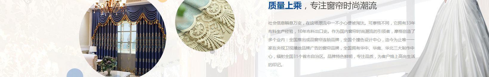 取源于中華悠久紡織文化的摩格(MOONGOOL)品牌,始終堅持“健康、時尚、精致”的產(chǎn)品觀,引領(lǐng)軟裝布藝行業(yè)進(jìn)入高品質(zhì)生活。產(chǎn)品設(shè)計風(fēng)格融入歐式低調(diào)奢華元素及國際流行時尚趨勢,先后開發(fā)了古典巴洛克、簡約洛可可、經(jīng)典中式(新中式)、時尚地中海、浪漫田園、唯美美式、原木風(fēng)、奶油風(fēng)、現(xiàn)代簡約風(fēng)九大風(fēng)格系列產(chǎn)品,擁有各種花型、工藝、材料面料達(dá)1500余種。其中窗簾產(chǎn)品作為摩格核心產(chǎn)品頗受消費者青睞。采用高精密、棉麻、雪尼爾等上千種布料的摩格窗簾用高端的新興工藝制作,絨面柔軟,織物華麗,九大截然不同的風(fēng)格同時搭配種類繁多的布類花型和不同的制造工藝,顏色或艷麗或素雅或大氣,簡約而不簡單。無論哪一款窗簾,都在注解不一樣的故事,也詮釋著自己的絕佳格調(diào)。正因為如此,個性獨特和創(chuàng)新思維賦予摩格更多的市場商機(jī)。